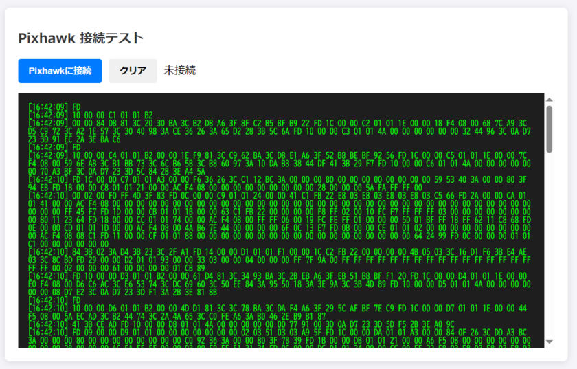 よく見るとデータの先頭に FD という文字が混ざっているのがわかります。これは MAVLink v2 という通信プロトコルの開始合図。ブラウザが正しくPixhawkの信号を捉えている証拠です。